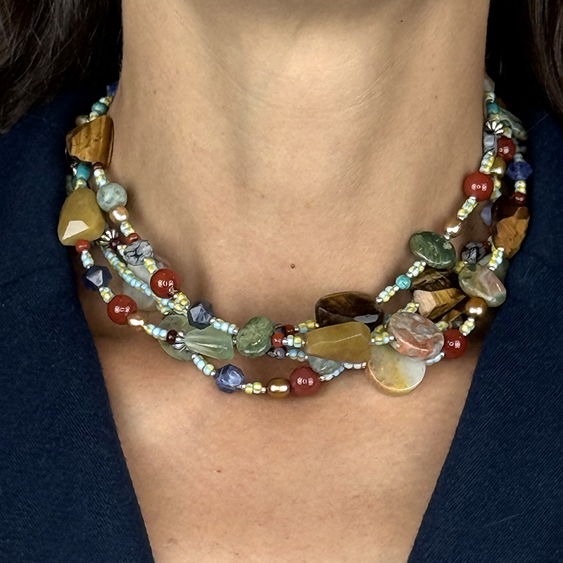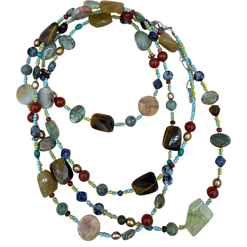 -Materials: African turquoise, carnelian, tiger eye, sodalite, jasper, quartz, and more