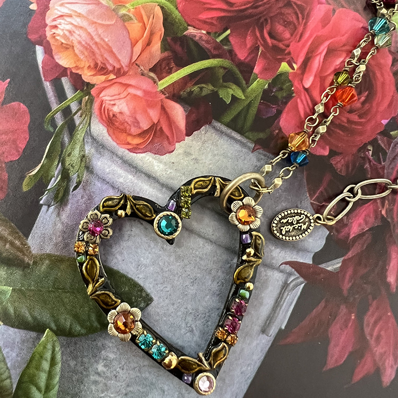 A trail of gorgeous leaves and blossoms encircles this elegant heart pendant. Michal’s open heart necklace is a classic piece, the dark color of this one is the perfect contrast to the romantic heart shape.