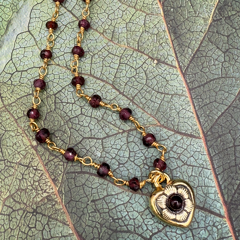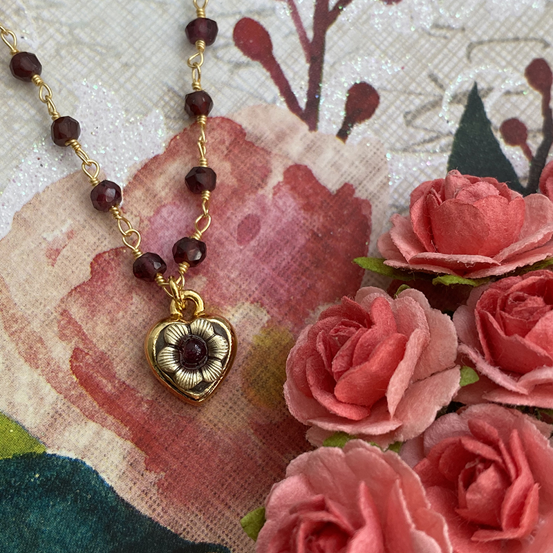 The tiny heart of this pendant contrasts with the victorian style garnet chain.